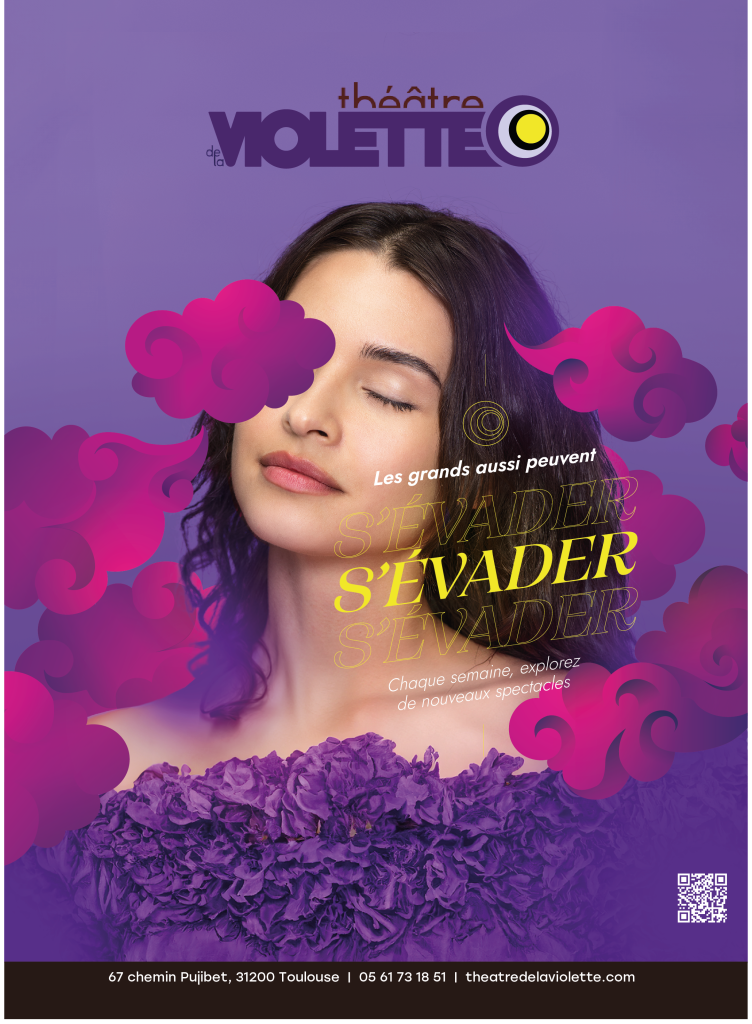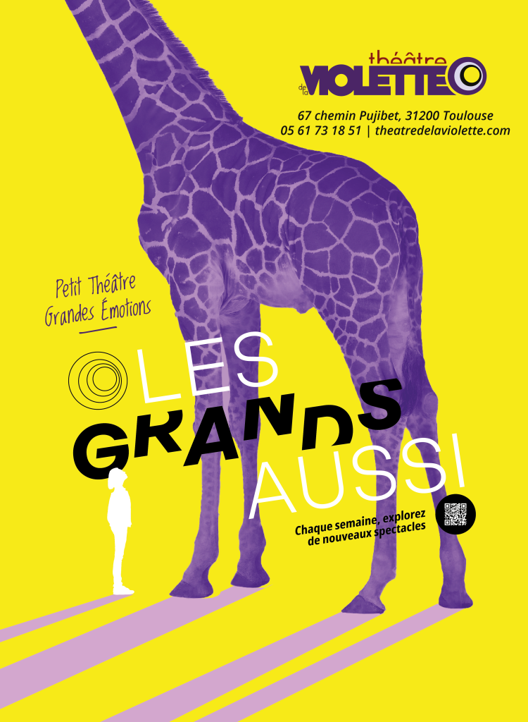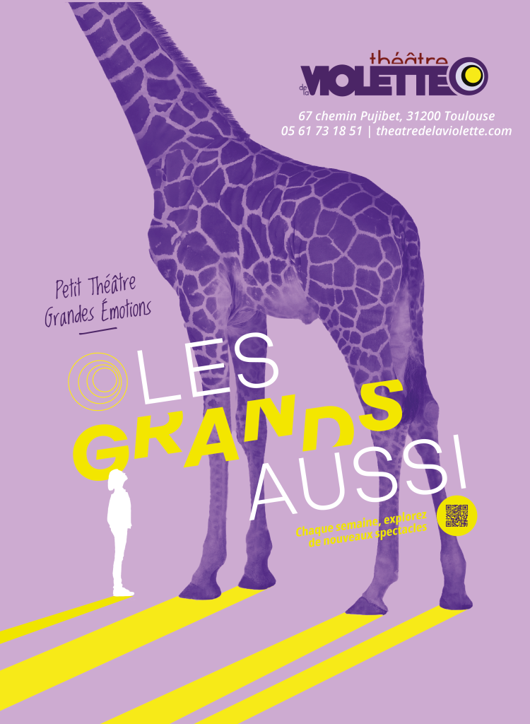 Le Théâtre de la Violette à Toulouse lance une campagne d’affichage pour promouvoir ses spectacles adultes tout en conservant leur caractère ludique. L’affiche met en scène un petit personnage admirant une girafe géante, symbolisant l’émerveillement que procure le théâtre. Les couleurs emblématiques du théâtre, violet et jaune, renforcent son identité visuelle. Le contraste entre le personnage et la girafe surdimensionnée crée une atmosphère surréaliste, invitant le public à plonger dans un monde de rêve. Cette approche distinctive attire l’attention sur les spectacles adultes tout en véhiculant un message d’émerveillement pour tous les âges, renforçant ainsi la reconnaissance de la marque.